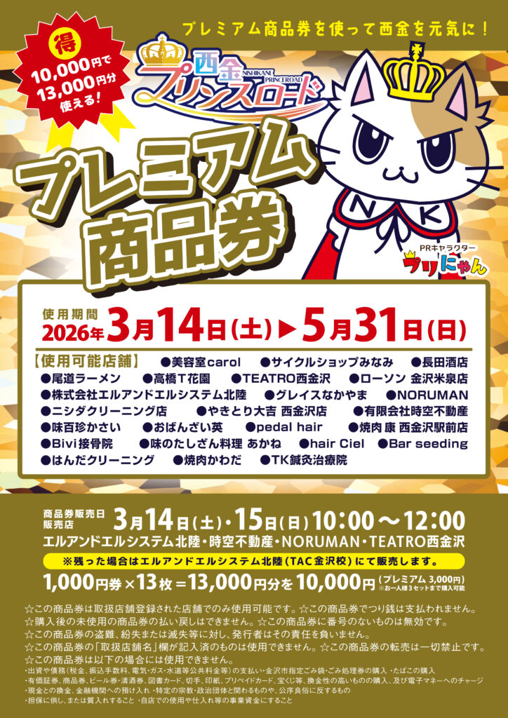 2026年3月14日(土)~5月31日(日)の間、お使いいただける「プレミアム商品券」を販売致します。